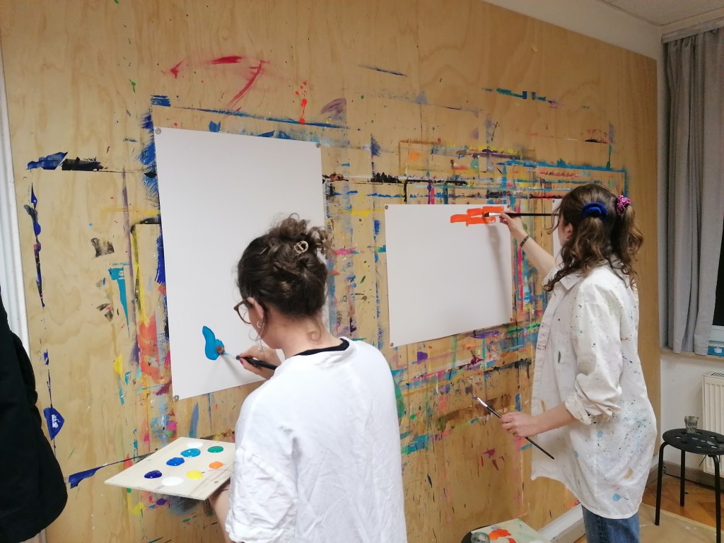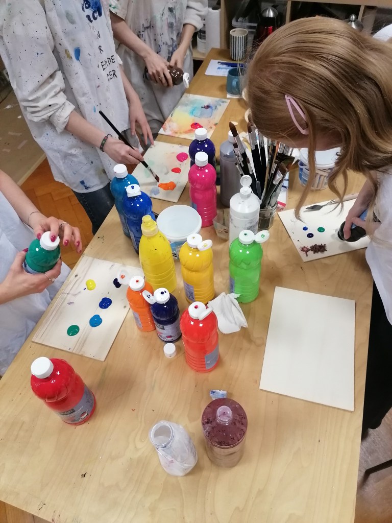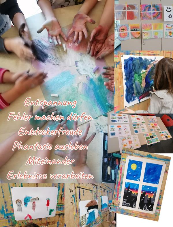 Ausdrucksmalen mit verschiedenen Farben und Techniken wie Kreide, Kohle, Bleistift, Aquarell und Gouache,